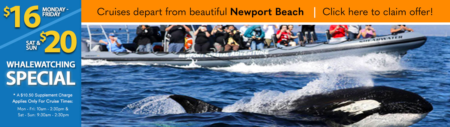 $7 Off Ultimate Whale Watching Adventure Cruise - Newport Beach, CA (Save 10%) Ultimate Whale Watching -Newport Coastal Adventure To receive $7 off per person you can go online at select date and cruise time and hit book now then enter Promo 7off in "add promo code box" and hit apply or just give us a call and mention Promo "7off" when reserving.