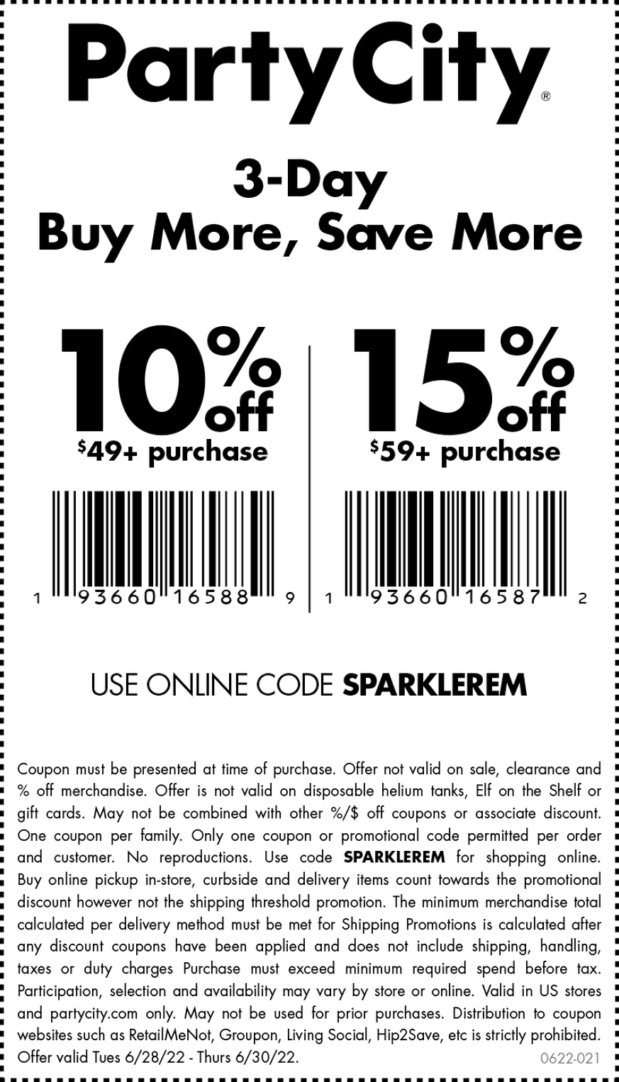 15% Off Party City Coupons, Promo Codes September 2022 - RetailMeNot.com Party City's Current Coupons & Promo Codes 242 uses today See Details Unpopular Coupons 15% OFF Sale 15% Off Select Personalized Graduation See Details 40% OFF Online & In-Store 40% Off Select Halloween Decor Items Get Online Deal Show In-Store Details See Details 15% OFF Code 15% Off Any Halloween Purchase of $49+ Added by dealsaver